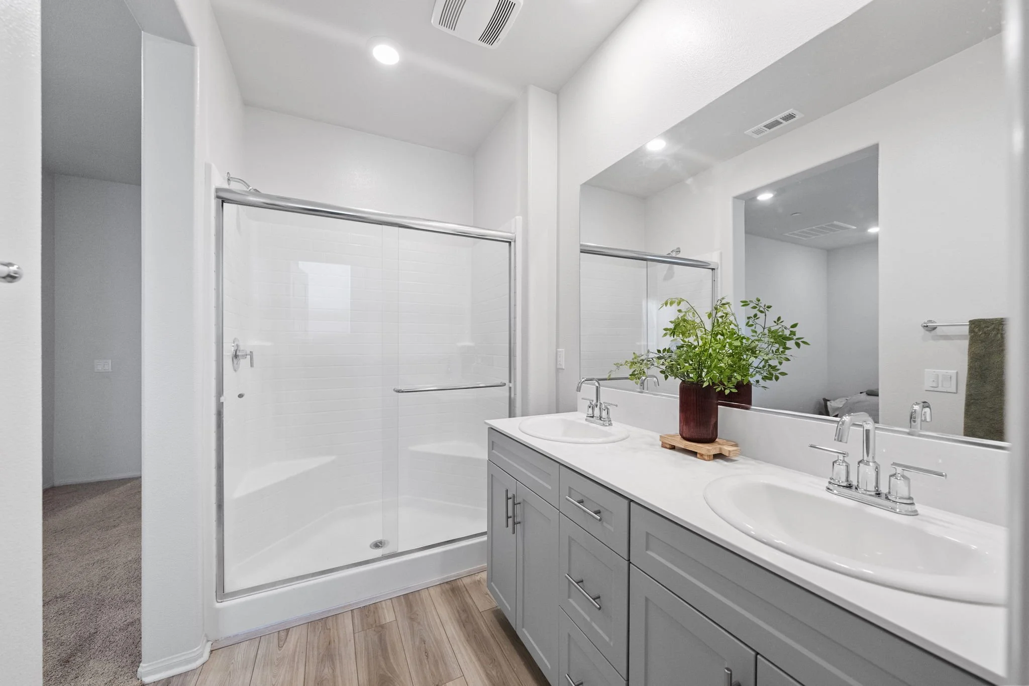 Head upstairs to the bright and spacious open-concept living area, designed to maximize natural light. The kitchen is equipped with modern appliances and sleek finishes, making it perfect for both everyday living and entertaining. Plus, the home comes complete with a washer, dryer, and refrigerator, so you can move in with ease. Upstairs, you'll discover two generously sized bedrooms, each with its own en-suite bathroom, offering ultimate privacy and comfort. The spacious primary suite features a walk-in closet and a luxurious bath with dual vanities.