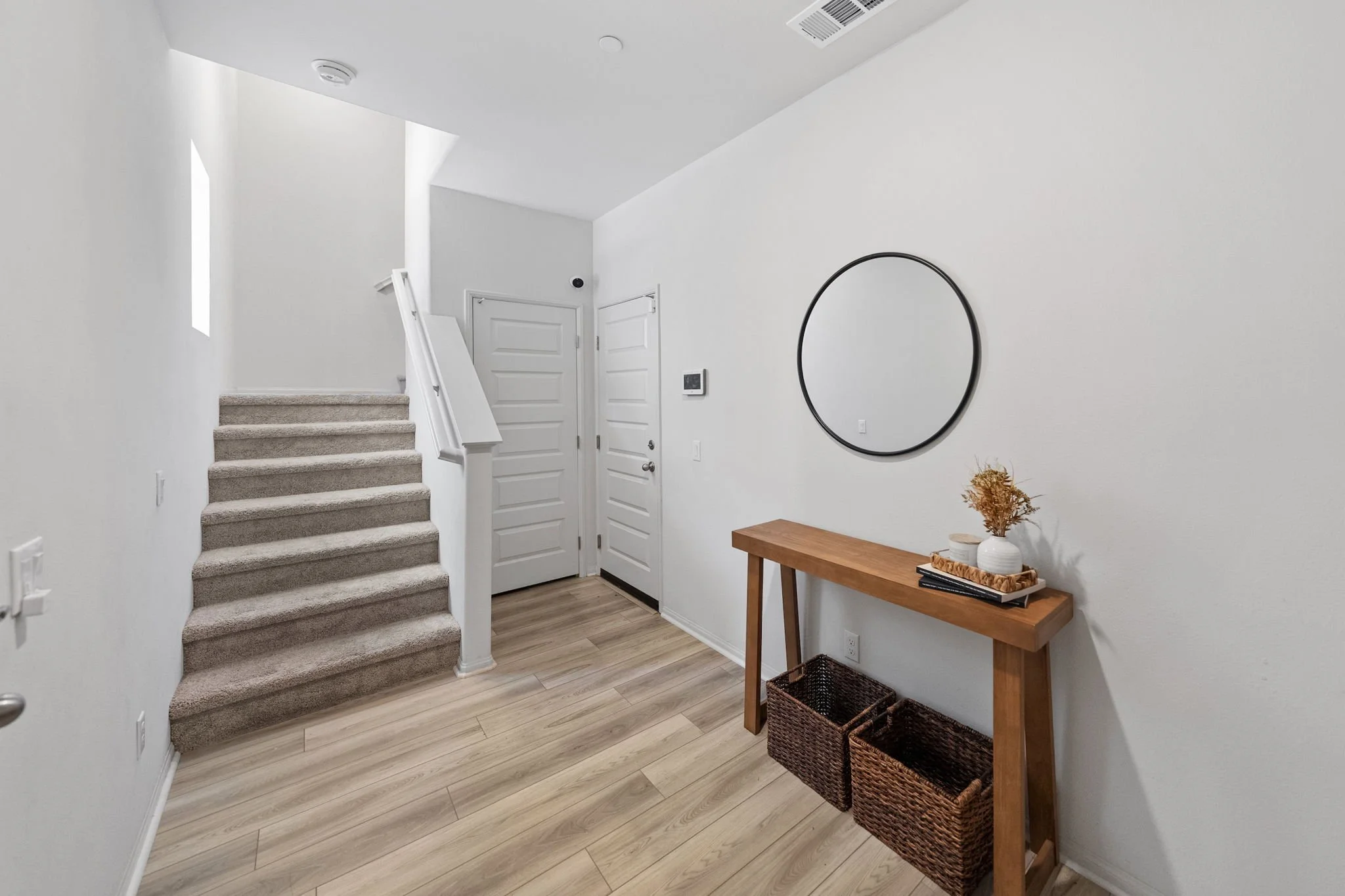 Welcome to 40545 Melrose Drive, a gorgeous 3-story townhome in the desirable Heirloom Farms community, ideally located in the heart of Temecula! This stunning Sultana Plan 1 offers 2 bedrooms, 2.5 bathrooms, and a perfect blend of style, comfort, and convenience. Built in 2023, this home feels like new - but better - featuring a beautifully landscaped front porch, custom lighting, upgraded window coverings, and fully owned solar panels for maximum energy efficiency. As you enter, you'll find a welcoming foyer with easy access to the garage.